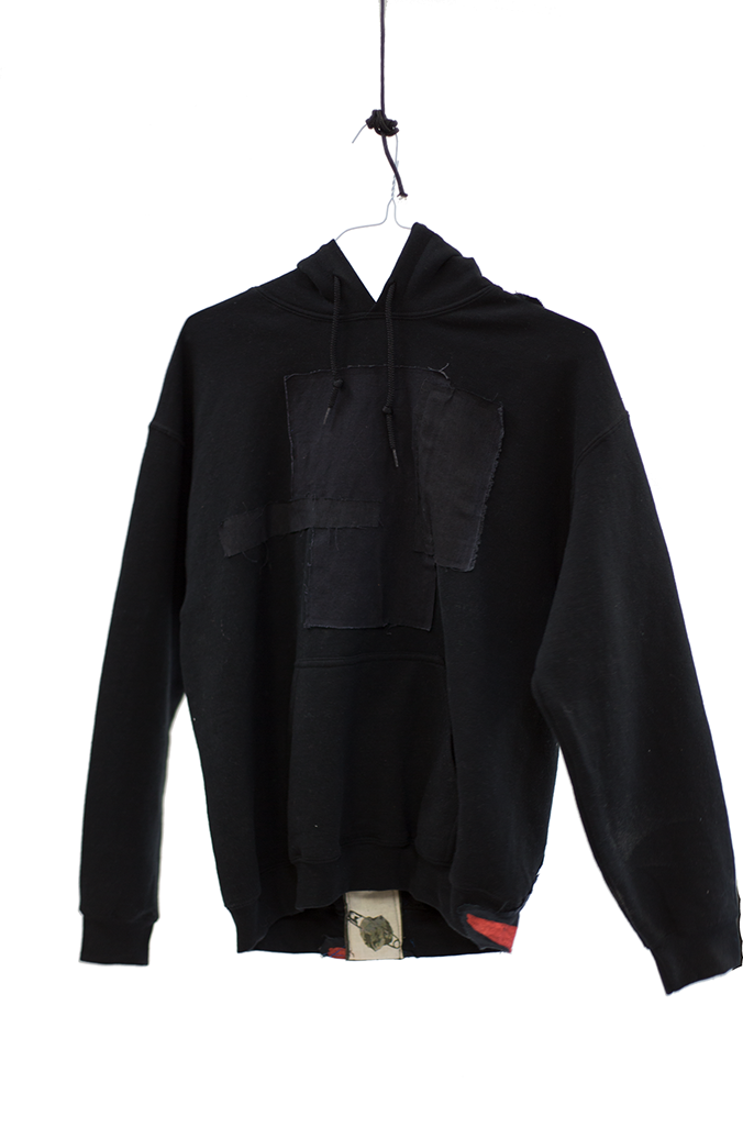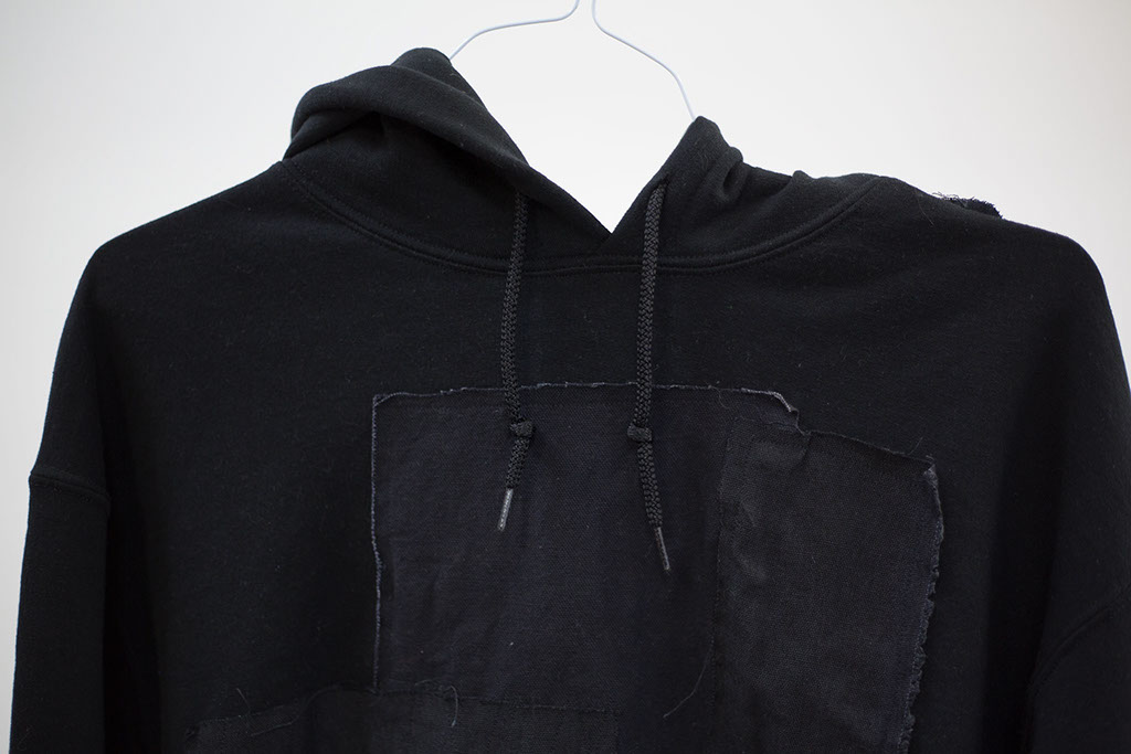 Stacy.House Up-cycled Hoodie Made-to-order. Limited Quantity. 50/50 Cotton Polyester Up-cycled Hoodie Full-length printed skeleton patch on back. Canvas patching all-over. Full-length printed tag. Available in blue, heather gray and hi-lighter yellow in limited sizes at an extra cost. All printing, sewing and dyeing done by hand. Expect slight variations.