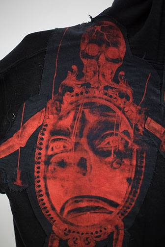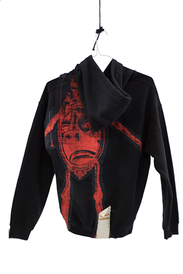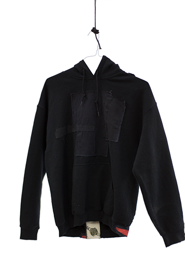 Stacy.House Up-cycled Hoodie Made-to-order. Limited Quantity. 50/50 Cotton Polyester Up-cycled Hoodie Full-length printed skeleton patch on back. Canvas patching all-over. Full-length printed tag. Available in blue, heather gray and hi-lighter yellow in limited sizes at an extra cost. All printing, sewing and dyeing done by hand. Expect slight variations.